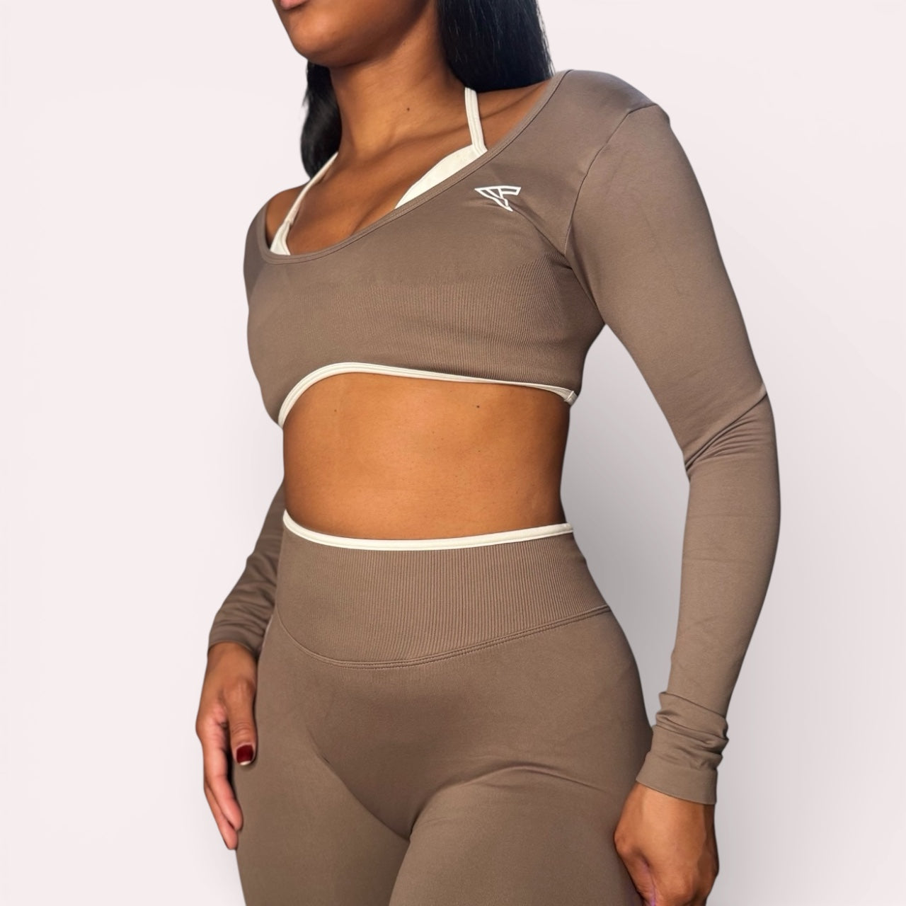The Athena Pulse Cropped Long Sleeve merges athletic function with refined elegance. This versatile piece features a built-in adjustable halter sports bra for customizable support, while crisp white trim adds a polished touch. The open back design creates an effortlessly chic silhouette, perfect for workouts that transition seamlessly into your day. Engineered for movement without compromising style.